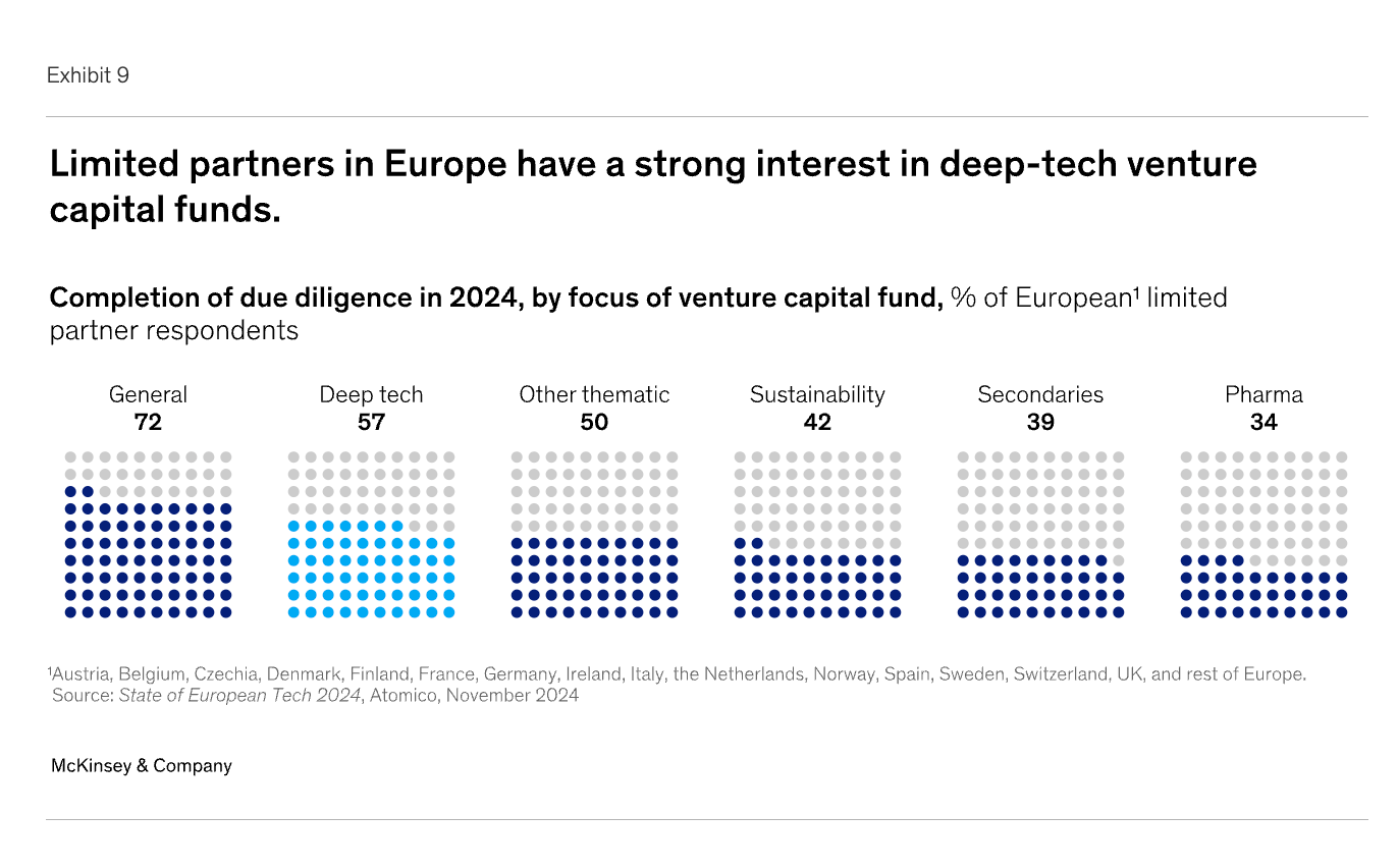 European limited partners are showing strong, growing interest in deep-tech venture funds, as the data makes clear. In 2024, deep tech ranked just behind generalist funds in LP due diligence activity, ahead of many other popular strategies such as sustainability, secondaries, and pharma.