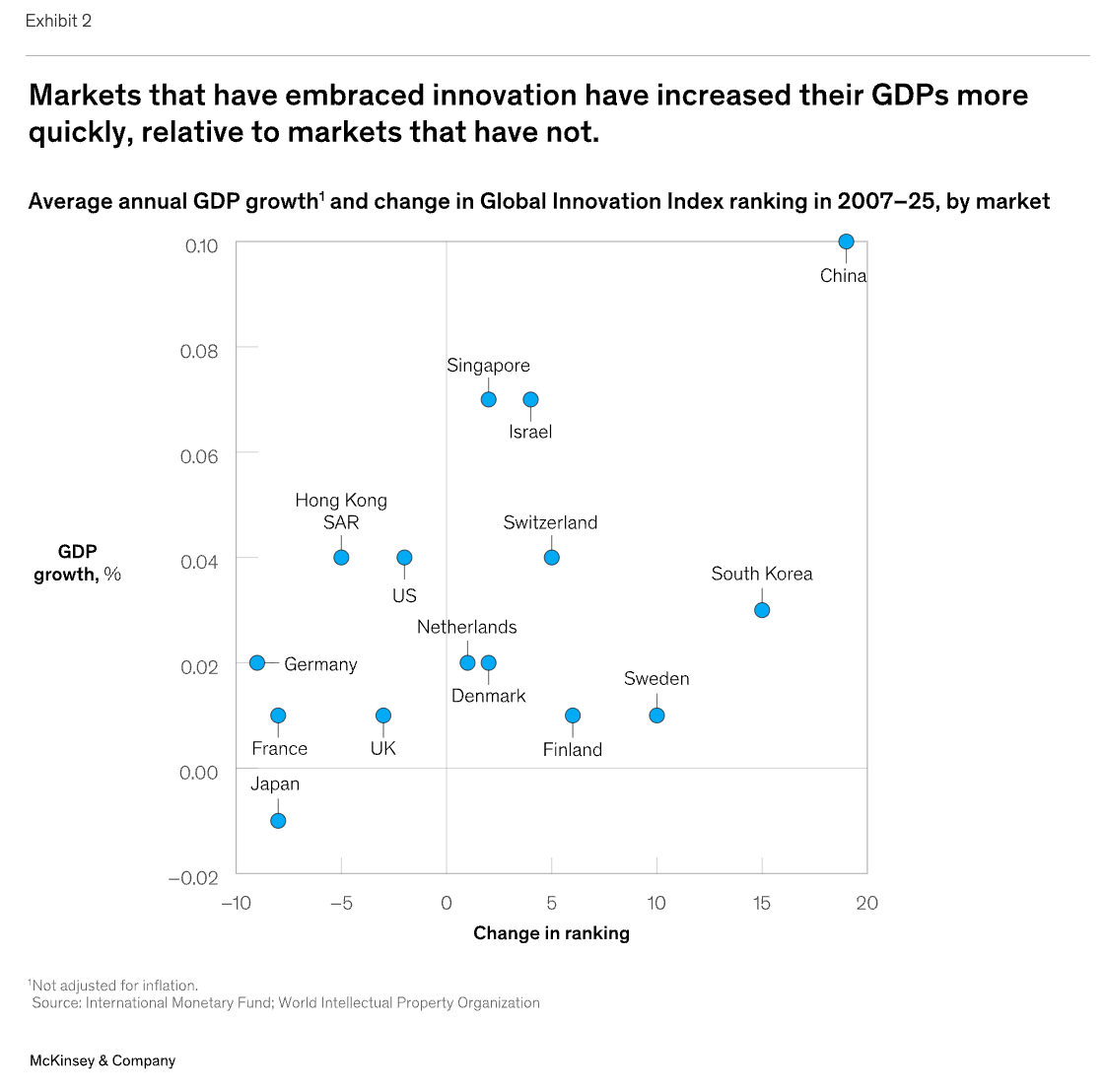 At the same time, global data shows a clear link between innovation and economic growth. Countries that have invested heavily in innovation, such as the US, China, Israel, and Singapore, have seen stronger GDP growth over the past two decades. Europe, by contrast, has underinvested in turning research into market-leading companies. DeepTech sits at the center of that gap.