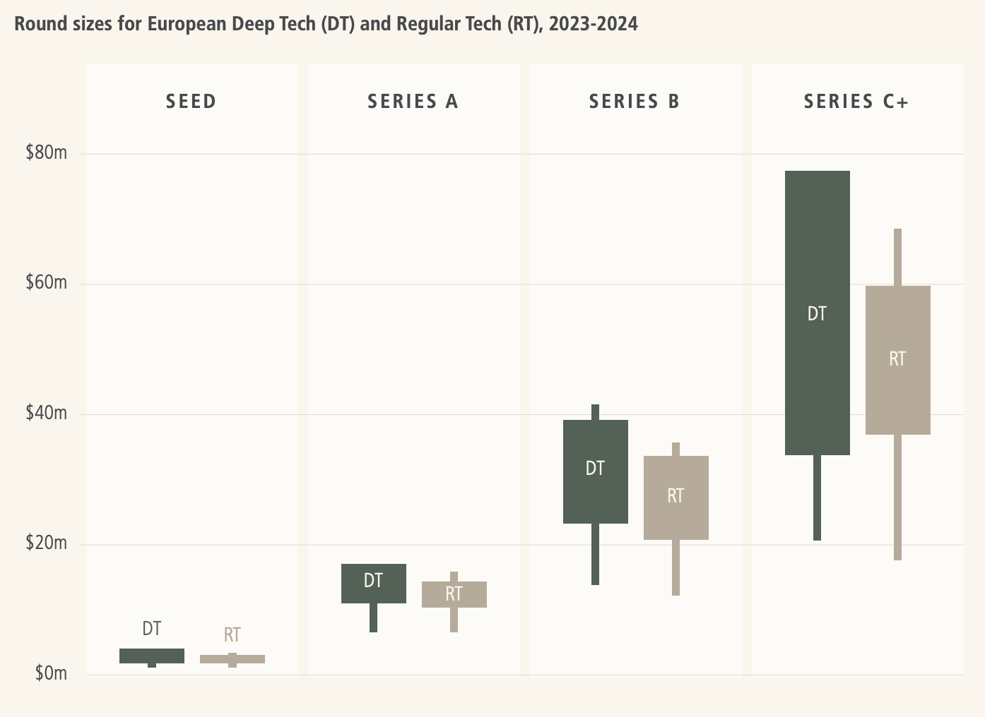 Investors are willing to commit more capital earlier when they believe the underlying technology can support large, defensible outcomes. By Series C and beyond, the difference narrows at the median, but the best deep-tech companies still pull ahead, showing that when deep-tech works, it attracts disproportionately large checks and sustained investor conviction.