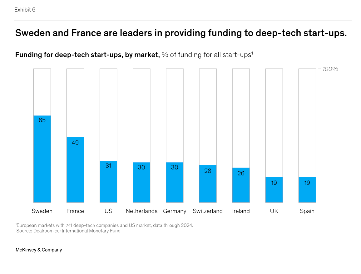 Sweden is a particularly strong example of how policy, capital, and long-term thinking can reinforce each other. Today, 65 percent of all startup funding in Sweden goes into deep-tech companies—more than any other European country.