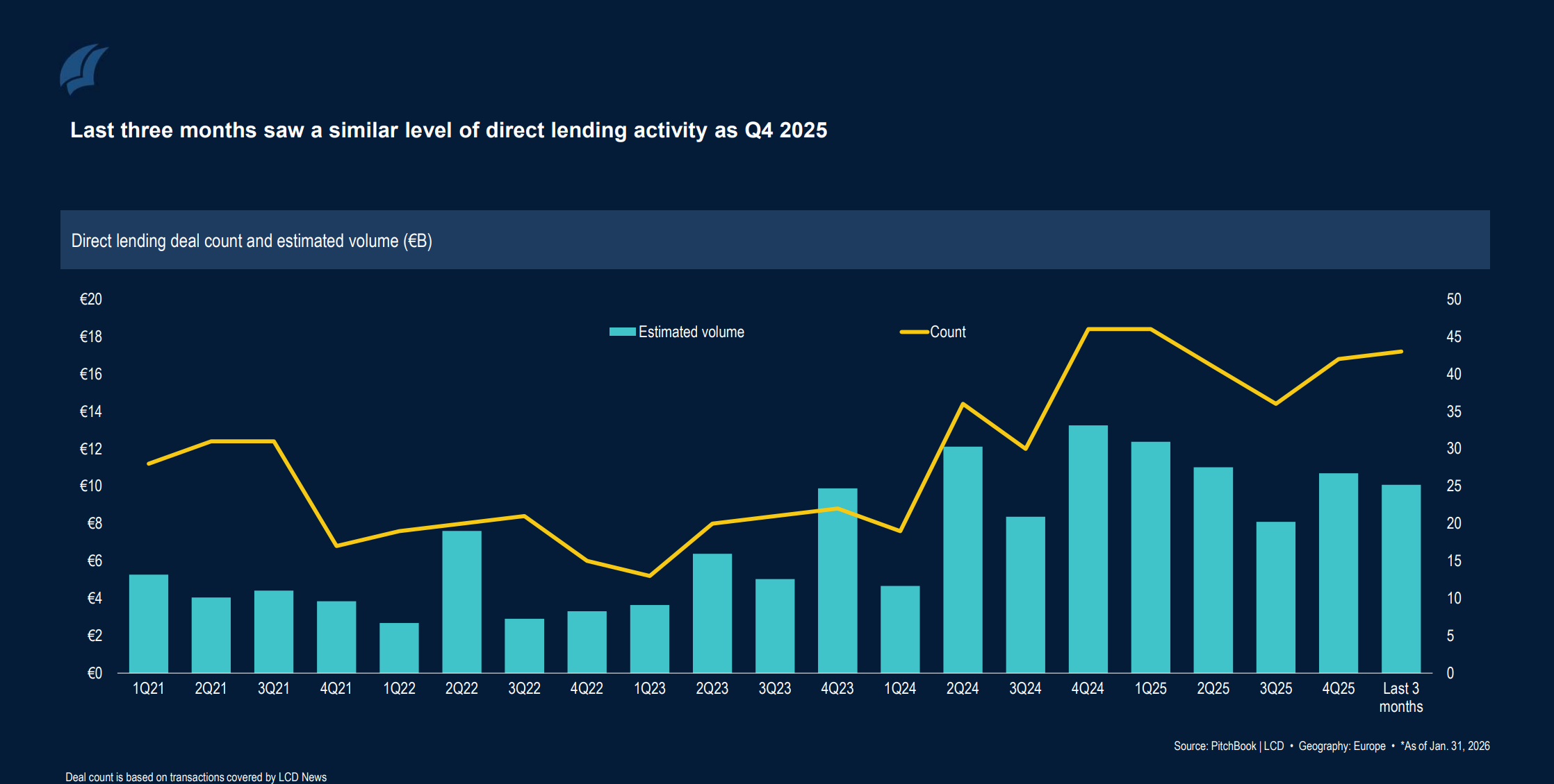 What stands out most is that acquisition financing is firmly back at the center of issuance. In January alone, 86% of direct lending loans supported M&A activity, totaling just over €2 billion in volume. LBO activity has been trending upward since the dip in Q3 2025, and in recent months, direct lenders have funded more than five times as many buyouts as the broadly syndicated market.
