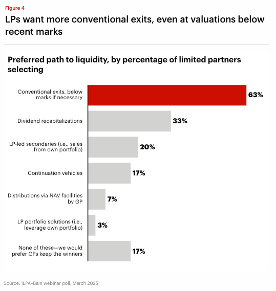 The Private Equity Midyear Report 2025 by Bain & Company shows that LPs are prioritizing liquidity, even if it means accepting exits at lower valuations. A majority now prefer traditional routes such as trade sales and IPOs, while interest in continuation vehicles and other structured solutions remains limited.
