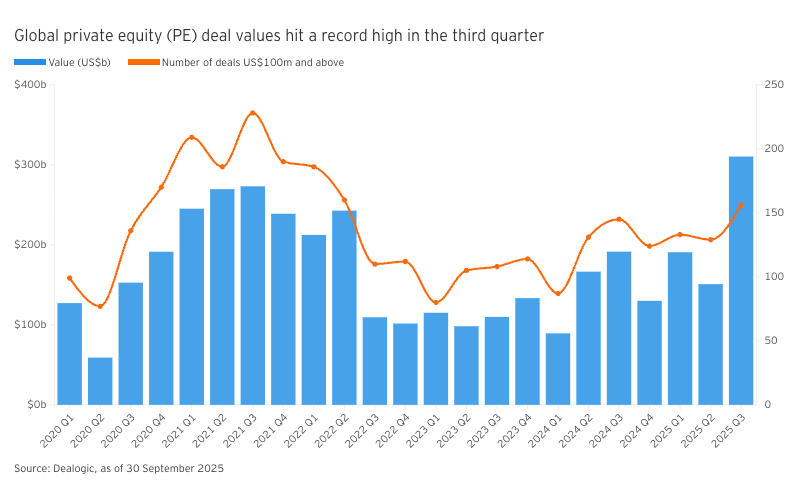 Private equity dealmaking picked up speed in the third quarter of 2025. Global PE deals reached a record US$310 billion across 156 transactions, helped by a handful of very large buyouts.